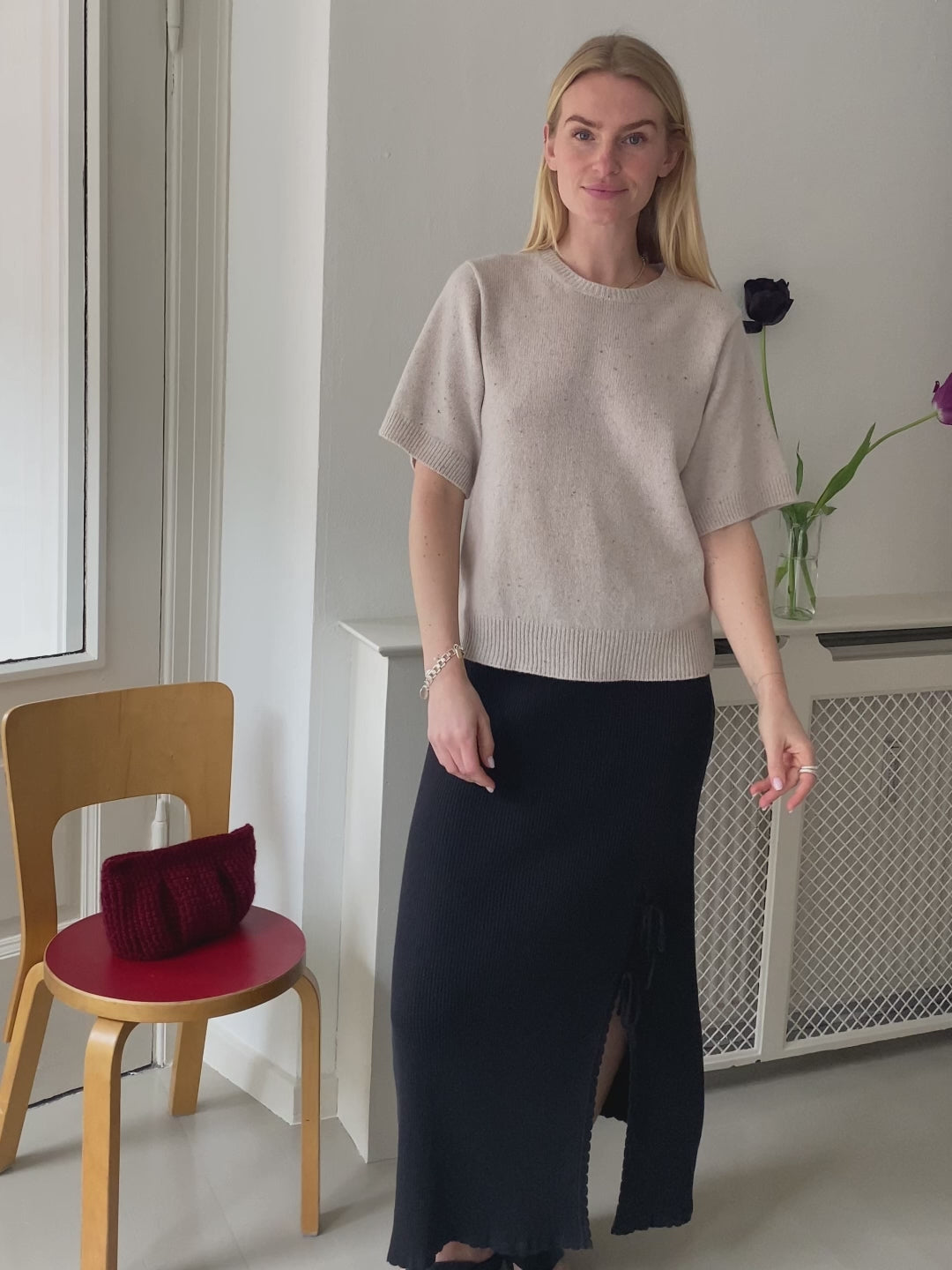 Our dream short-sleeved knitted tee, Kajsa. The most exclusive bouclé yarn in recycled cashmere makes sure you feel blessed when wearing it. The casual straight fit and simple look allows you to style it in various ways, and we guarantee this will be your go-to piece. The cashmere is so soft you only want to wear it with a bra underneath, and the tiramisu coloured yarn is light and soft, but at a closer look you will see small sparks of colour naps in the bouclé yarn. The simplicity of the tee features extravagant details like the knitting pattern & technique at neck opening and the signature Proem outside seam centeret at the back ending with a slit. Suitable for both dressing up for evenings out because of the exclusive yarn, pair with a shirt or blazer for office days or relaxing times at home teamed with a pair of Rakel Trousers.